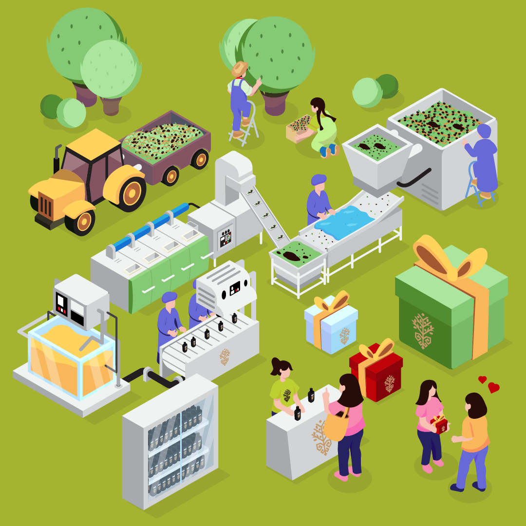 Schlussendlich gelangt unser extra natives Olivenöl in bester Qualität und Form auf Ihren Tisch. Unvergessliche Momente bleiben auf den Tischen und der Geschmack bleibt am Gaumen. Ein Happy-End für alle!